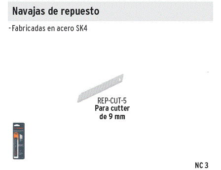 Volver a: Ferretería NAVAJA Descripción NAVAJA DE REPUESTO CUTTER TRUPER SET 10 CUCHILLAS 9 MM CODIGO 16962 Haga una pregunta sobre este producto Comentarios Aún no hay comentarios para este producto.