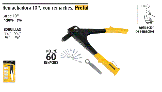 REDUCCIONAzadón Córdoba / (175x235 mm) Volver a: Ferretería REMACHADORA Descripción REMACHADORA DE 10 PLGS CON REMACHES MARCA PRETUL CODIGO 22851 Haga una pregunta sobre este producto Comentarios Aún no hay comentarios para este producto.