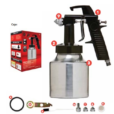 Pistola de succión que mezcla la pintura con el aire de manera interna, cuenta con una campana reemplazable, lo que permite ampliar la vida útil de esta herramienta.