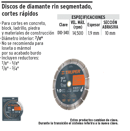 REDUCCIONAzadón Córdoba / (175x235 mm) Volver a: Ferretería DISCO Descripción DISCO DIAMANTE CORTE RAPIDO RIN SEGMENTADO MARCA TRUPER VEL MAX DE 14,500 / ESPESOR 1.9 MM /DIAMETRO 4" CODIGO 11581 Haga una pregunta sobre este producto Comentarios Aún no hay comentarios para este producto.