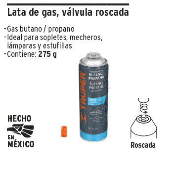 REDUCCIONAzadón Córdoba / (175x235 mm) Volver a: Ferretería LATA DE GAS Descripción LATA DE GAS CON VALVULA ROSCADA DE 275 gr CODIGO 11915 Haga una pregunta sobre este producto Comentarios Aún no hay comentarios para este producto.