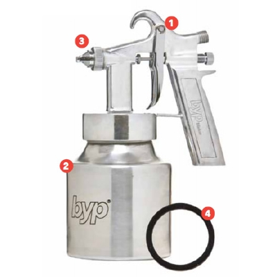 Pistola de succión que mezcla la pintura con el aire de manera externa. Trabaja con presión e incluye vaso de metal. Es fácil de operar y maniobrar, su bajo consumo de aire, la hace especial para trabajos con materiales de media y baja viscosidad. Vaso extra reforzado.